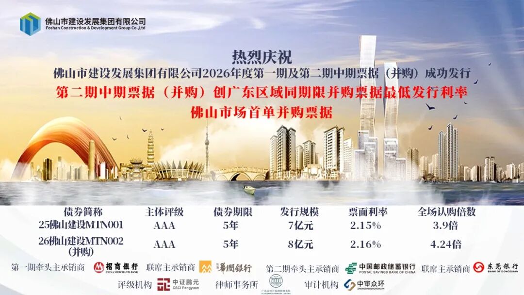 近日,佛山建发集团再添资本市场创新成果!佛山建发集团成功发行2026年度第二期中期票据(并购),发行规模8亿元,期限5年,票面利率2.16%,全场认购倍数高达4.24倍。本期债券为佛山市首单并购票据,更创下广东区域同期限并购票据利率最低纪录,彰显了市场对集团综合实力与发展前景的高度认可。