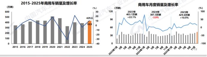 除了乘用车的稳健表现,商用车市场的复苏成为2025年车市的一大亮点。2025年全年商用车产销回归400万辆以上,分别完成426.1万辆和429.6万辆,同比增幅均超10%。其中,新能源商用车销量达87.1万辆,同比大幅增长63.7%,渗透率快速提升。货车市场,特别是重型货车销量同比增长27%,反映出实体经济物流需求的活跃。