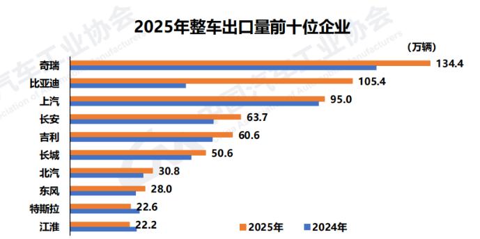 与此同时,企业国际化策略呈现差异化格局。奇瑞、比亚迪、上汽位列出口量前三,其中比亚迪出口量同比激增1.4倍至105.4万辆。整车出口与海外本地化生产并进的模式,正助力中国汽车产业深度融入全球市场。