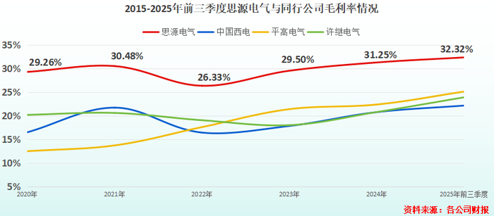 2020-2025年第三季度,公司毛利率一直在30%左右,与同行拉开了差距。2025年前三季度,公司毛利率进一步提升到32.32%,高出中国西电、平高电气和许继电气足足有5个百分点。