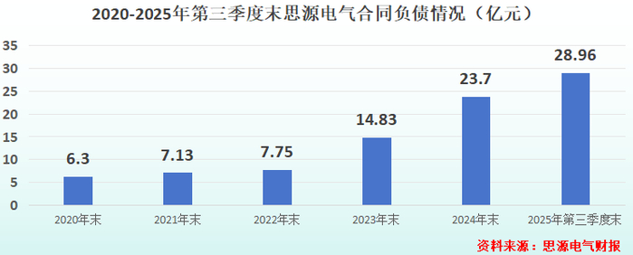 2020-2025年第三季度末,思源电气合同负债逐步攀升,从6.3亿元上升到28.96亿元,充分体现出公司还有后劲。