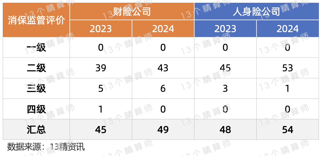 2. 96家消保监管评价为二级,同比增加:寿险53家,财险43家!