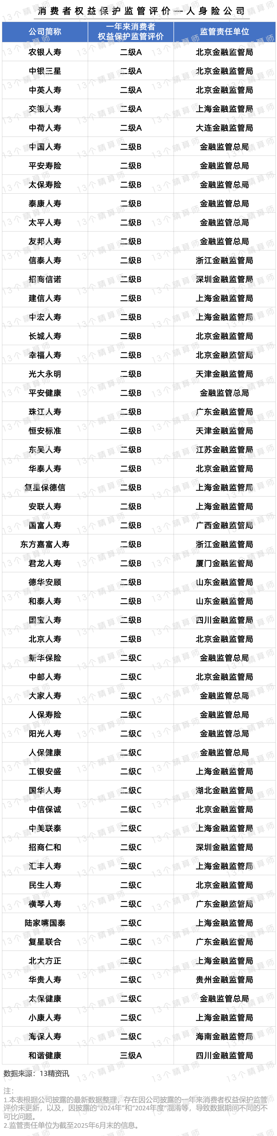 “13精”统计,截至目前,有103家险企披露了最新的消保监管评价结果,详见上图。