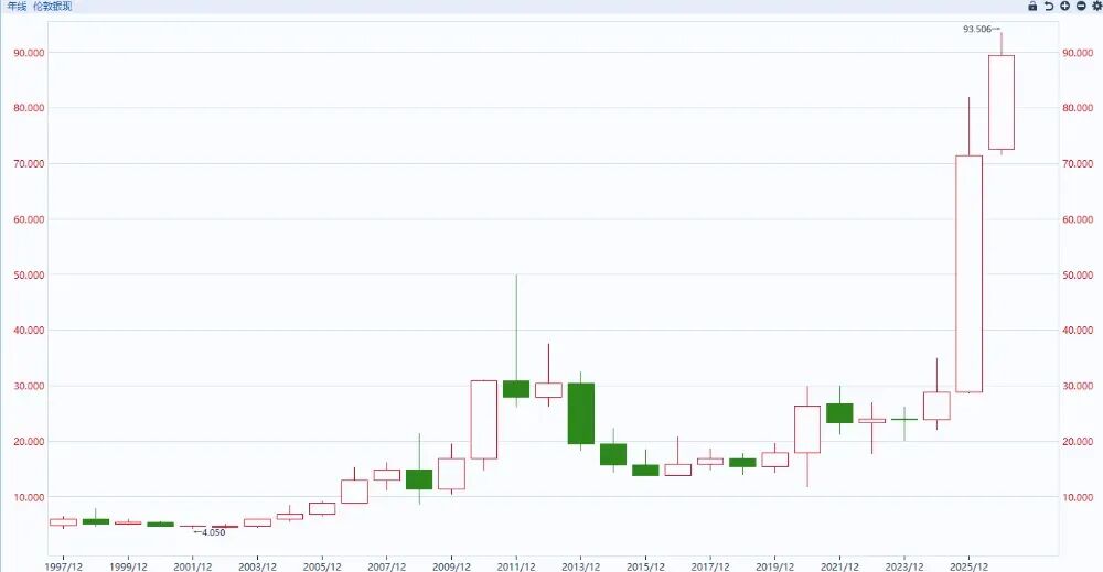 伦敦现货白银价格在1月14日历史性突破90美元/盎司大关,最高触及91.55美元,年内涨幅已狂飙26%。更令人咋舌的是,过去三年间,银价从20美元/盎司左右一路飙升,累计涨幅近400%,彻底甩开黄金,成为贵金属市场的“涨势先锋”。