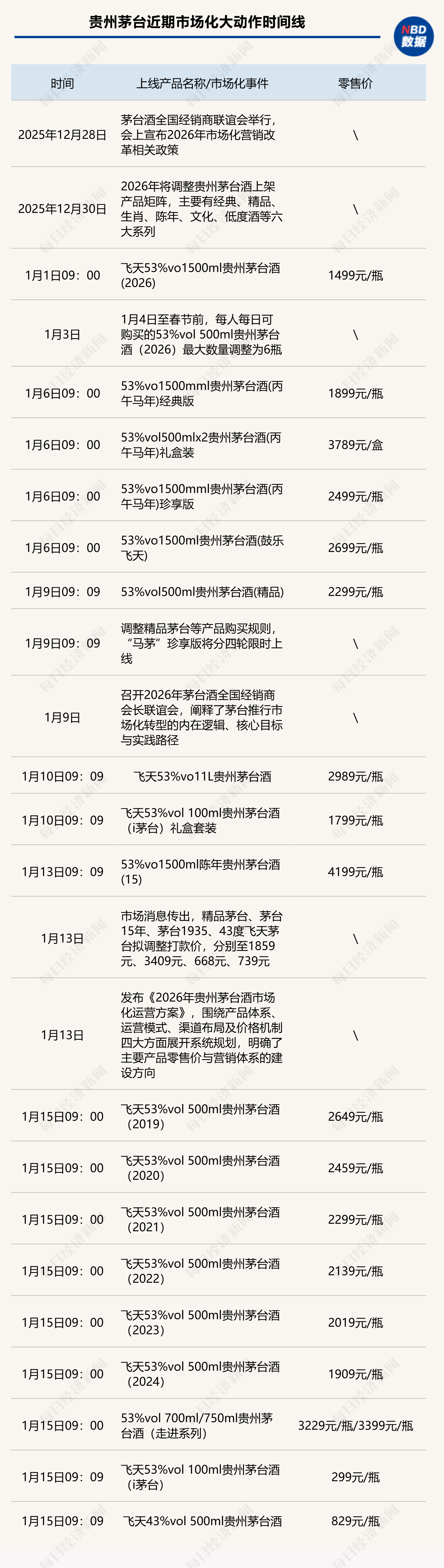《每日经济新闻·将进酒》记者梳理了“i茅台”上新日历,1月1日~1月15日,短短15天时间就有近20款茅台酒上线。不仅如此,其上线抢购的价格也出人意料。2026年飞天茅台直接以1499元/瓶销售,就连新一轮马年生肖茅台酒,经典版也来到了1899元/瓶,低于去年蛇年生肖茅台酒的价格。