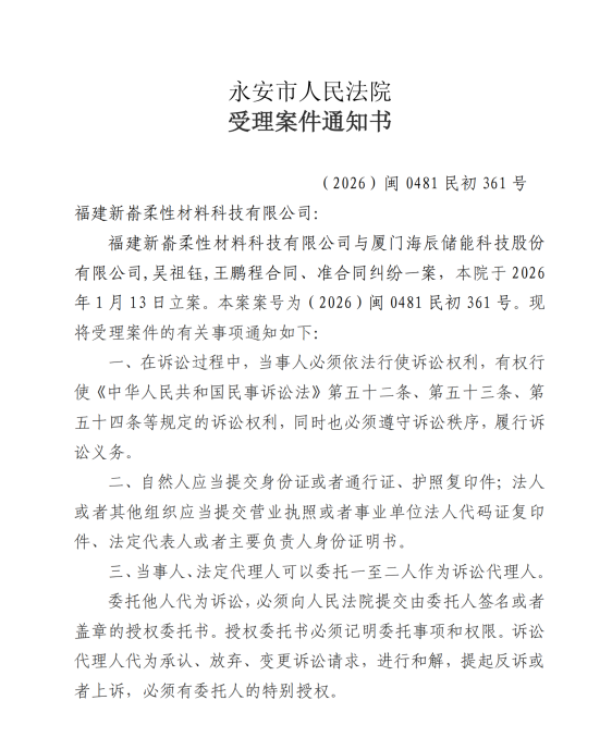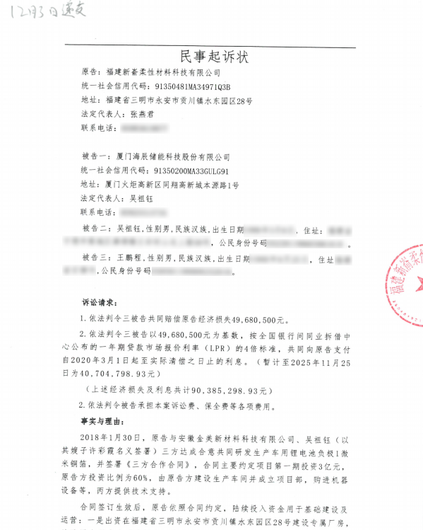 最新消息显示,张瑞明出具了民事起诉状,将海辰储能和吴祖钰、王鹏程列为被告。要求“三被告共同赔偿经济损失49680500元及资金占用利息40704798.93元,共计90385298.93元。2026年1月13日永安市人民法院已受理。后续的进展如何,则需要等待法院审理结果。