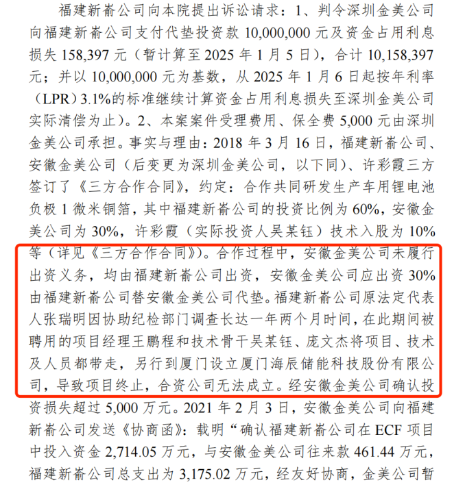 福建新嵛向法院提及的主要诉讼请求包括:一是向深圳金美公司向福建新嵛公司支付1000万元及资金占用利息。二案件受理费用、保全费5000元由深圳金美公司承担。理由是“合作过程中,安徽金美公司未履行出资义务,均由福建新嵛出资,安微金美公司应出资30%由福建新嵛公司替安微金美公司代垫。在张瑞明因个人原因离开公司一年两个月时间,在此期间被聘用的项目经理王鹏程和技术骨干吴某钰、庞文杰将项目、技术及人员都带走,别行到厦门设立海辰储能,导致项目终止,合资公司无法成立。”
