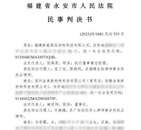 2025年12月26日,福建省三明市永安市人民法院作出一份民事判决,支持了福建新嵛高分子材料有限公司(以下简称“福建新嵛”)实控人张瑞明对深圳金美新材料科技有限公司(下称“金美公司”)提出的索赔诉求。法院认定,金美公司在2018年一项锂电池材料技术合作中未履行出资义务,判令其赔偿张瑞明1000万元及利息损失。