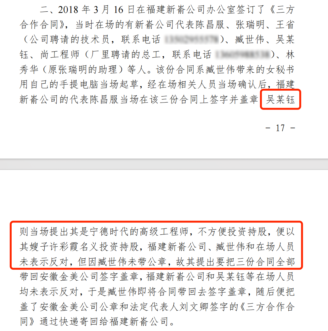 (2025)闽0481民初553号的民事判决书的判定印证了这一事实,“吴祖钰则当场提出其是宁德时代的高级工程师,不方便投资持股,便以其嫂子许彩霞名义投资持股,福建新嵛公司、臧世伟和在场人员未表示反对。”