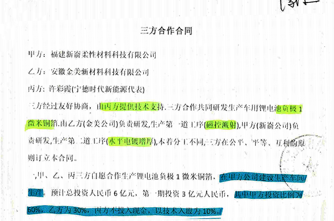 判决书显示,2018年3月,福建新嵛与金美公司、自然人吴祖钰签署《三方合作合同》。合同约定,项目总投资为6亿元,一期投资3亿元。依据协议,福建新嵛作为主要出资方及项目承接地,出资比例达60%;安徽金美负责提供铜箔生产技术,出资比例为30%;丙方许彩霞(宁德时代新能源代表)不投入现金,以技术入股为10%。