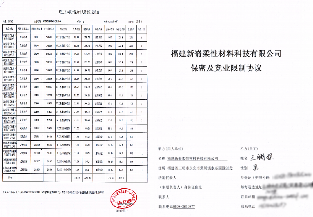 王鹏程就职福建新嵛期间的社保记录和保密协议