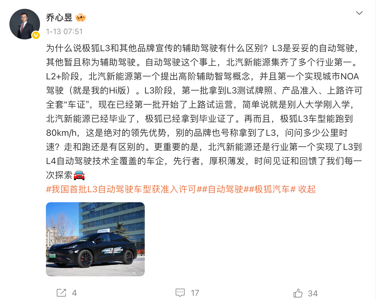 网通社快讯近日,北汽新能源极狐品牌用户运营中心副总经理乔心昱在其个人社交平台发文称,明确北汽新能源已成为行业首个实现L3至L4级自动驾驶技术全覆盖的车企。