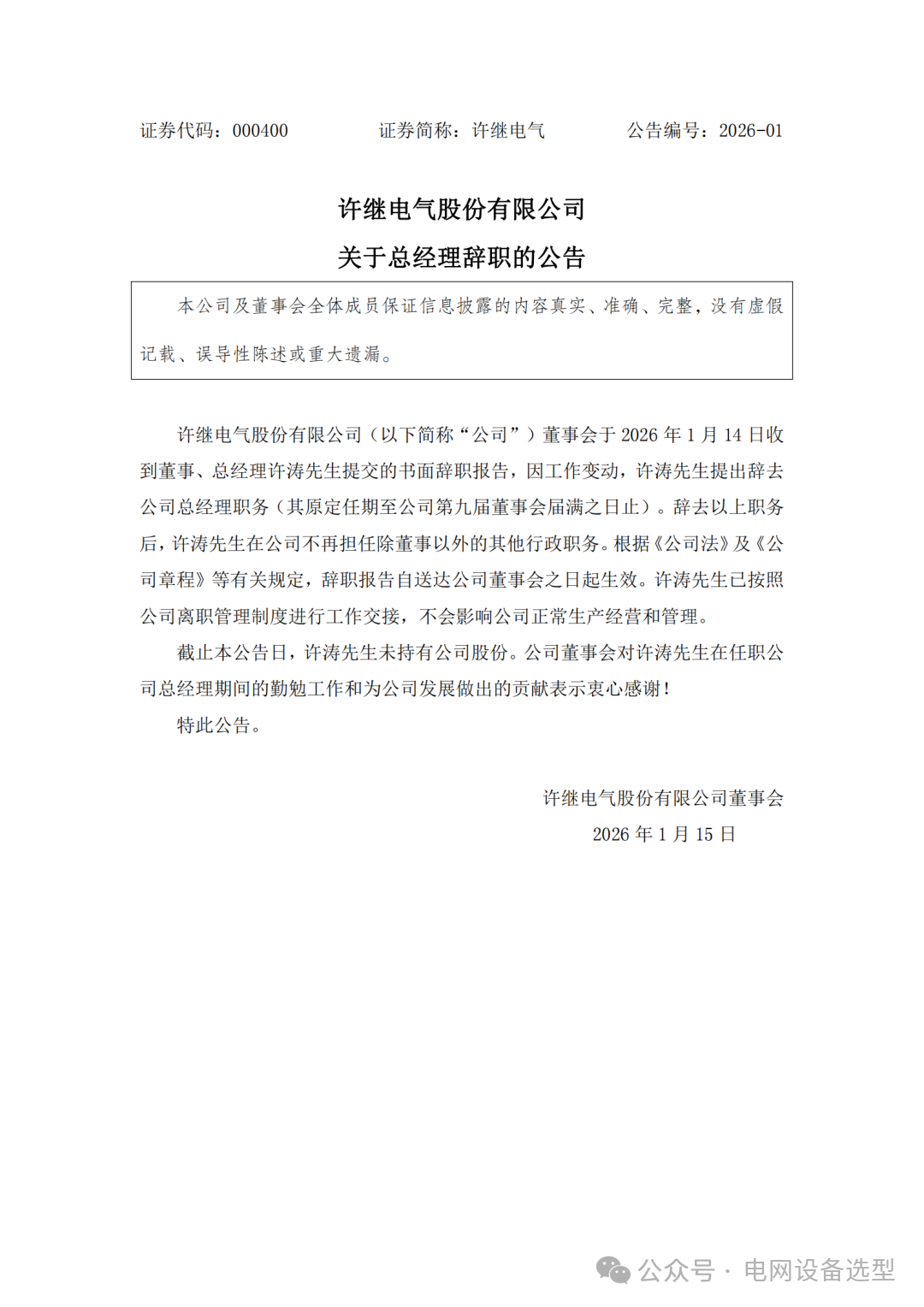 许继电气股份有限公司董事会于2026年1月14日收到董事、总经理许涛先生提交的书面辞职报告,因工作变动,许涛先生提出辞去公司总经理职务(其原定任期至公司第九届董事会届满之日止)。