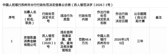 2026年开年消费金融行业合规警钟持续敲响。1月14日,中国人民银行苏州市分行公布行政处罚信息,苏银凯基消费金融有限公司因“违反信用信息采集、提供、查询及相关管理规定”,被处以48.4万元罚款。这是年内央行开出的第二张消费金融行业罚单,与此前中信消费金融因涉及个人征信违规被罚105万元。