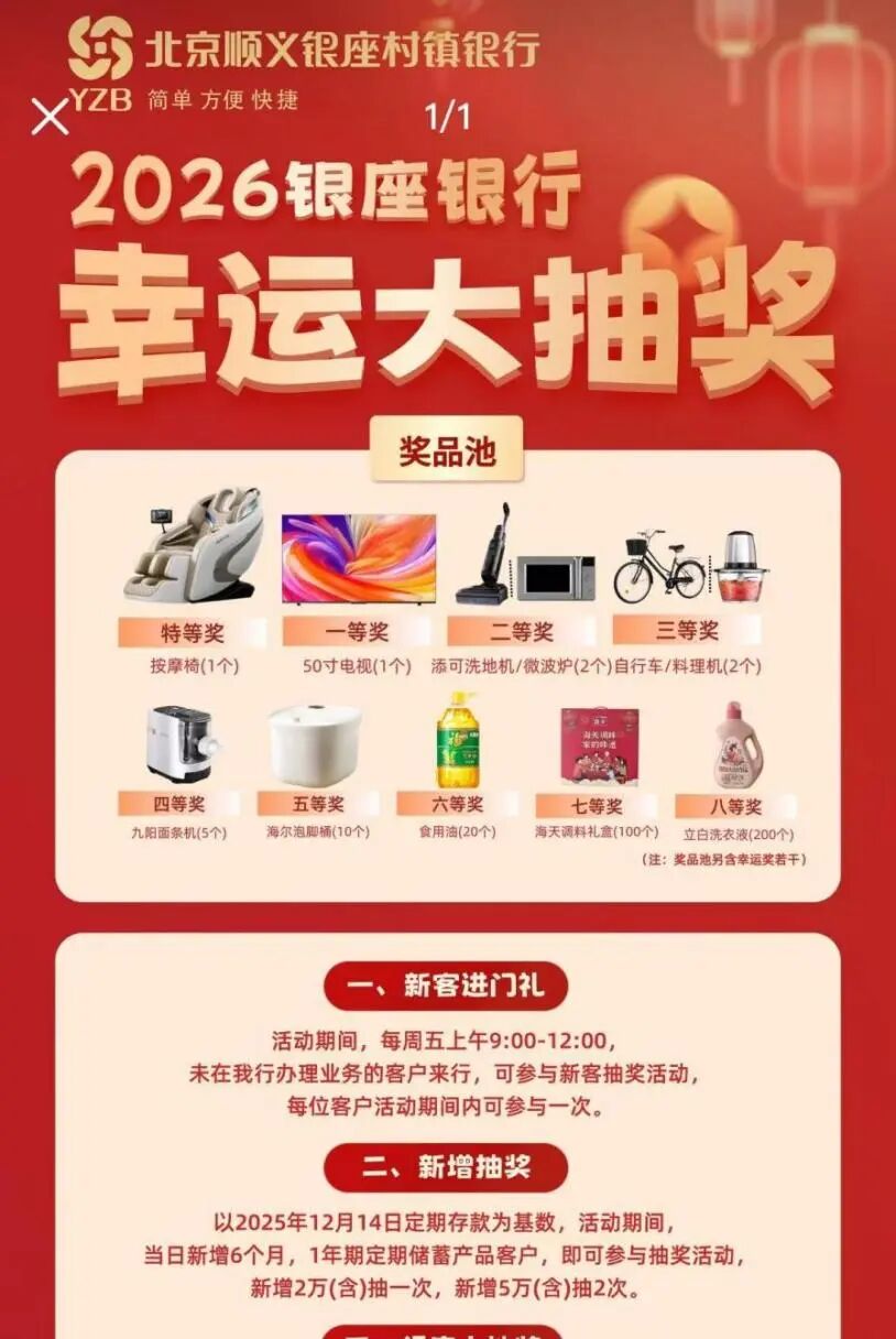 例如,北京顺义银座村镇银行发布公告称,如果是新客来该行办理存款业务,活动期间每周上午可以参与抽奖活动,且如果客户新增存款,每2万元存款可再抽奖一次,5万元则可参与2次抽奖,抽奖礼品包含按摩椅、50寸彩电、洗地机和微波炉、自行车、料理机和面包机等多款家庭实用用品。