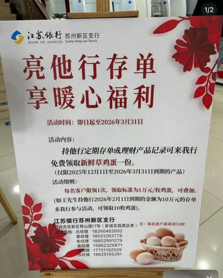 为“撬走”客户,江苏银行更别出心裁地推出“亮他行存单,享暖心福利”的活动,从2025年12月1日至2026年3月31日,只要客户持有他行定期存款或理财产品纪录,便可以在该行免费领取一份新鲜鸡蛋的活动,每1万元可领1枚鸡蛋,可叠加领取。