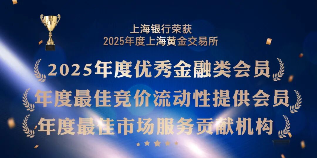 近日,上海黄金交易所公布2025年度评优结果,上海银行荣获“2025年度优秀金融类会员”“年度最佳竞价流动性提供会员”“年度最佳市场服务贡献机构”等多项奖项。