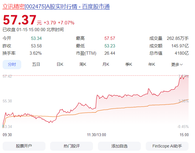 截至2026年1月15日收盘,立讯精密股价报57.37元/股,最新市值为4180亿元。