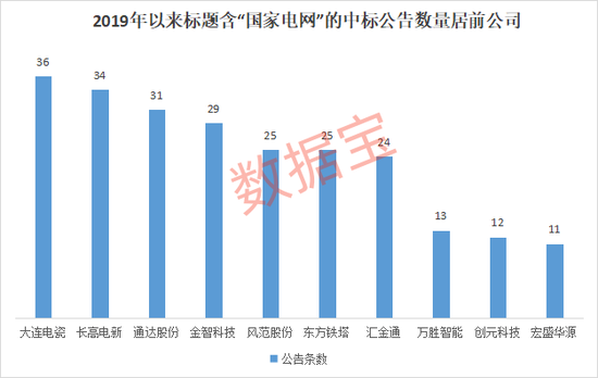从上市公司来看,2019年以来有10家公司发布了10条以上的中标公告,其中,大连电瓷、长高电新、通达股份(维权)数量排在前三,均发布了30条以上,就在2025年12月,这三家公司都发布了新的中标公告,金额分别为7070万元、1.61亿元、1.54亿元。除上述三家公司外,金智科技、风范股份、东方铁塔、汇金通中标公告均在20条以上。