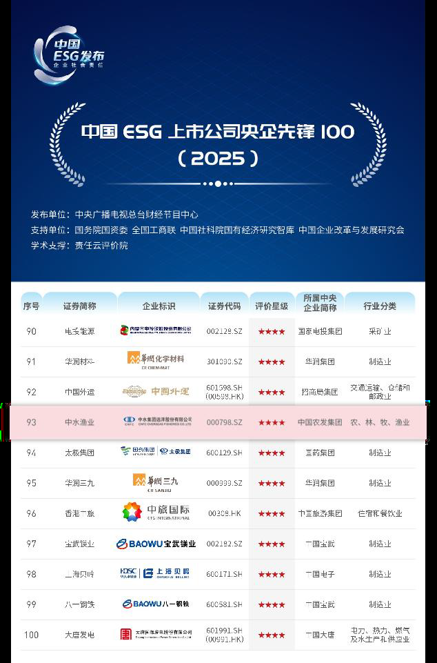 中水渔业荣登央视《中国ESG上市公司央企先锋100(2025)》榜单