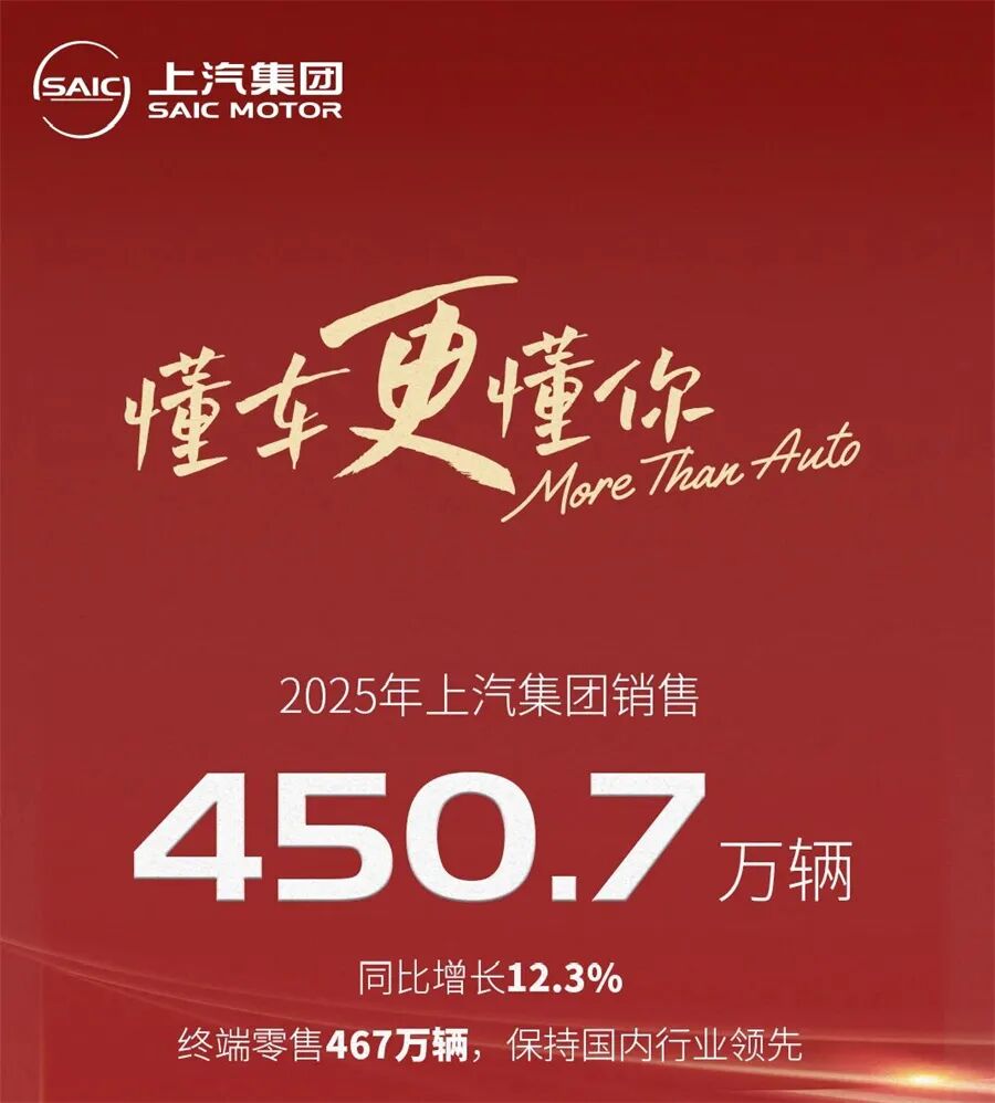 尽管同比增长438%到558%与上汽集团2024年利润的低基数有关,但2025年上汽集团的销量也是实打实的增长的。上汽集团日前发布的产销快报显示,2025年,上汽集团全年销量为450.7万辆,完成450万辆年度销量目标。甚至,考虑到其终端零售销量达467万辆,上汽在2025年是有机会成为零售口径下的销量冠军的。