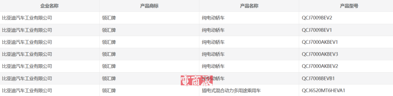 据了解,比亚迪共申报了7款车型,主要是纯电动轿车,以及插电式混合动力多用途乘用车。