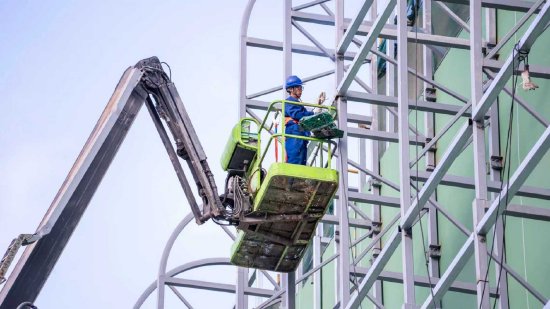 海南电网公司施工人员在220千伏碧海变电站开展建筑楼玻璃幕墙外立面施工(宋印官摄)