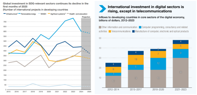 2024年,发展中国家与可持续发展目标相关的投资项目数量下降了10%,金额下降了7%。其中,全球流向发展中国家基础设施投资下降了35%,可再生能源投资下降31%,水和清洁设施投资下降30%,农业食品系统投资下降19%;医疗卫生部门相关项目虽增加了20%,但整体投资金额不足150亿美元。继2024年大幅下降之后,2025年前4个月统计数据,与可持续发展目标相关的投资项目数量进一步下降了10%。最不发达国家的项目有望在2025年再下降5%,可能降至2015年以来最低水平。
