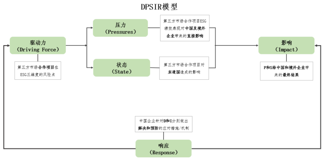 支持可持续发展的环境、社会和治理议题具有高度的经济发展阶段、自然资源、属地文化、技术条件、法制环境等特色化和重大议题差异,因而中国企业在“走出去”时亟需包含法律、公司治理、语言和文化、公共关系、生态环境及企业所在行业等跨领域ESG综合能力储备,进行相关服务支持和分工实践。如早在2021年,中财大绿金院发布的《中国基础设施项目第三方市场合作:ESG操作手册》中结合第三方那个市场合作项目开展过程中面临的多方要素挑战设计的ESG要素识别和操作手册,通过DPSIR-ESG“驱动力(Driving Force)—压力(Pressure)—状态(State)—影响(Impact)—响应(Response)”模型,全因果链的动态风险评估方法,探索有效圈定三方市场参与下的ESG议题和项目市场风险。