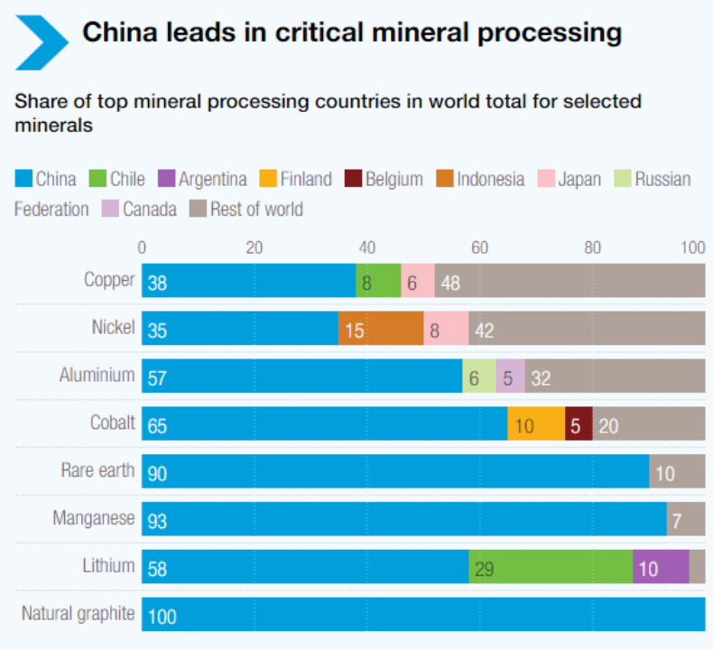 图3.部分主要矿物加工国家的世界总量占比