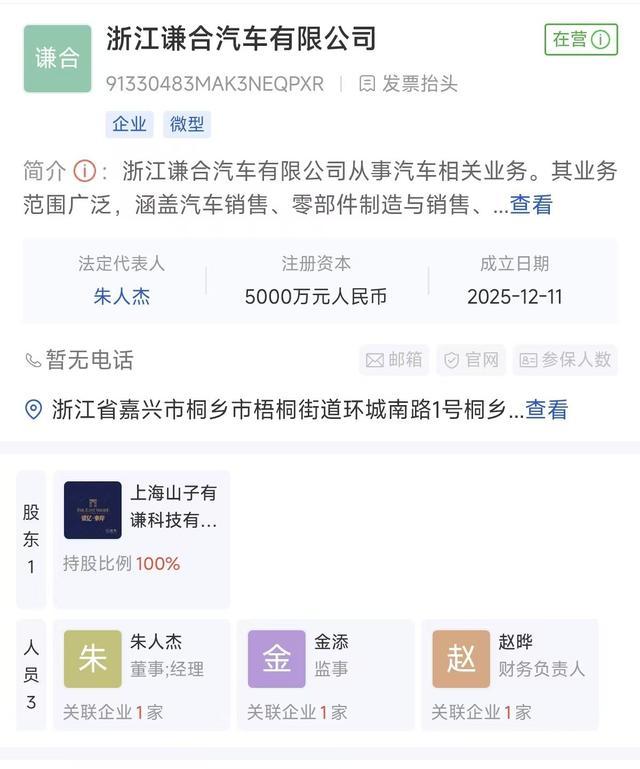 根据信息显示,谦合汽车由上海山子有谦科技有限公司全资控股,法人代表朱人杰是前特斯拉制造工程总监,而山子有谦则是上市公司山子高科的全资子公司。