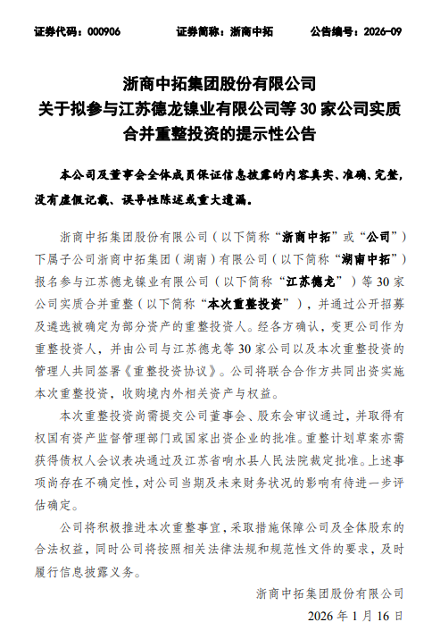 2026年1月15日,世界500强企业浙江省交通集团旗下浙商中拓集团股份有限公司(以下简称“浙商中拓”或“公司”)发布公告,下属子公司浙商中拓集团(湖南)有限公司(以下简称“湖南中拓”)报名参与江苏德龙镍业有限公司(以下简称“江苏德龙”)等 30 家公司实质合并重整(以下简称“本次重整投资”),并通过公开招募及遴选被确定为部分资产的重整投资人。经各方确认,变更公司作为重整投资人,并由公司与江苏德龙等 30 家公司以及本次重整投资的管理人共同签署《重整投资协议》。公司将联合合作方共同出资实施本次重整投资,收购境内外相关资产与权益。