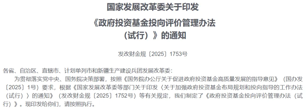 同步下发的,还有国家发展改革委制定的《政府投资基金投向评价管理办法(试行)》(下称《管理办法》)。