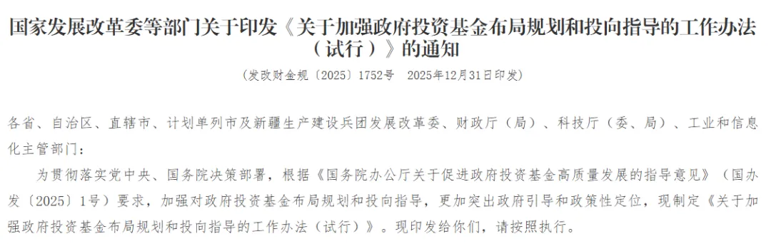 近日,国家发改委、财政部、科技部、工信部联合印发《关于加强政府投资基金布局规划和投向指导的工作办法(试行)》(下称《工作办法》),首次在国家层面对政府投资基金的布局和投向作出系统规范。