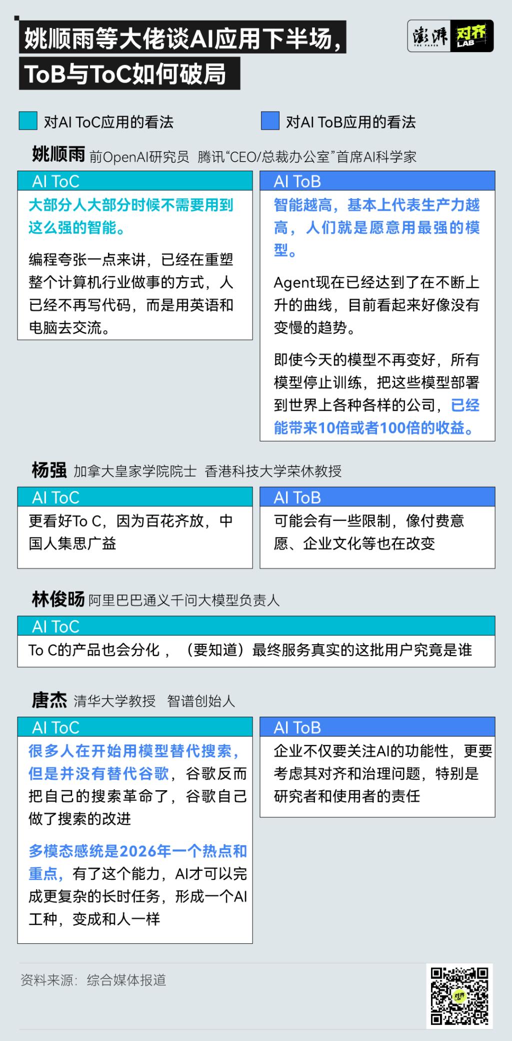 在探讨模型分化问题时,姚顺雨表示有两个最大的感受:一是“To C和To B发生了明显的分化”,另一个是“垂直整合、模型和应用分层,也开始出现了分化”。To C与To B出现明显分化,最典型的两个AI应用是ChatGPT(通用AI聊天机器人)和Claude Code(编程Agent)。姚顺雨认为,普通人大部分时候并不需要像ChatGPT这么强的智能,导致“今天用ChatGPT和去年相比,感受差别不是太大”。但是编程领域的AI能力已经开始重塑计算机行业的做事方式,“人已经不再写代码,而是用英语和电脑去交流”。
