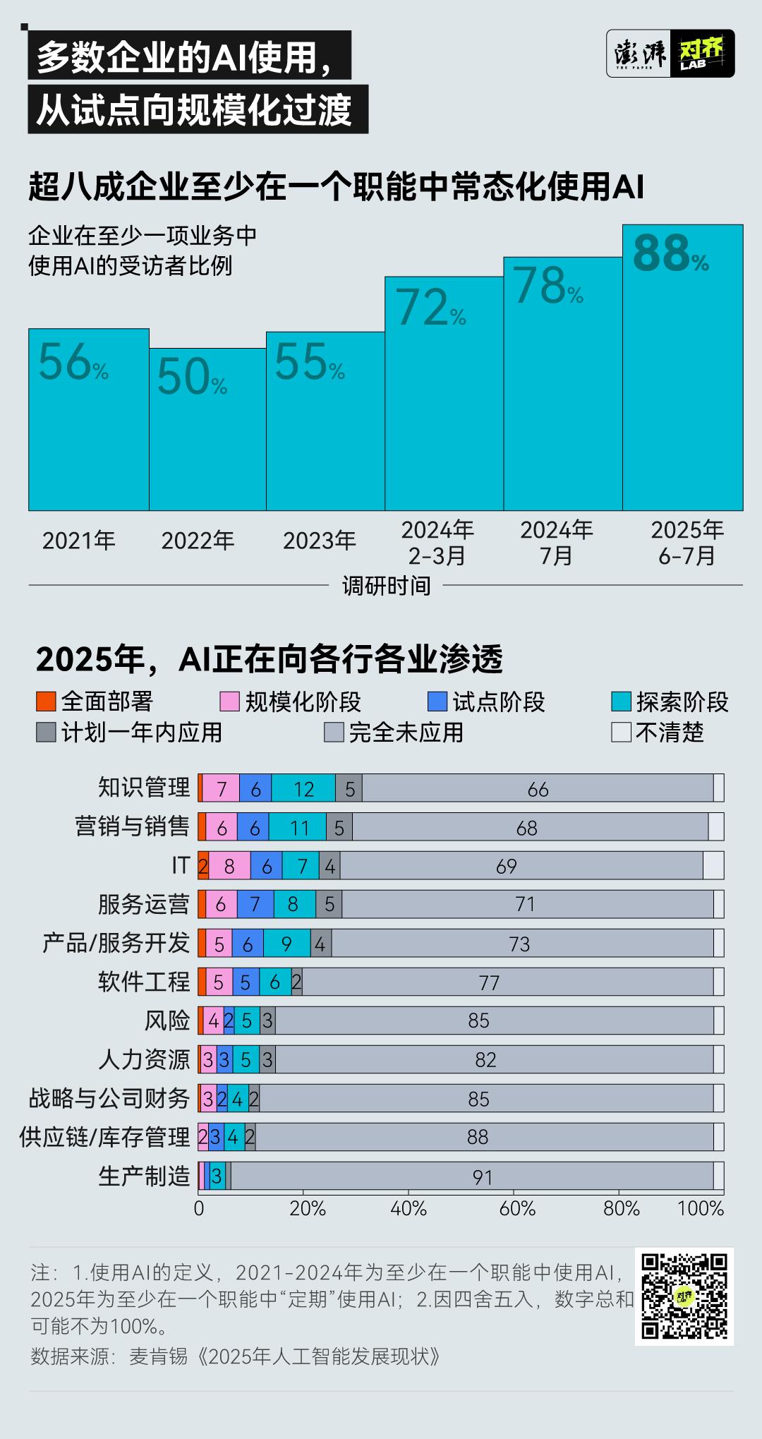 据麦肯锡《2025年人工智能发展现状》调研显示,越来越多的企业开始使用AI。在至少在一个职能中常态化使用AI的企业比例中,从2021年的56%上升至88%。