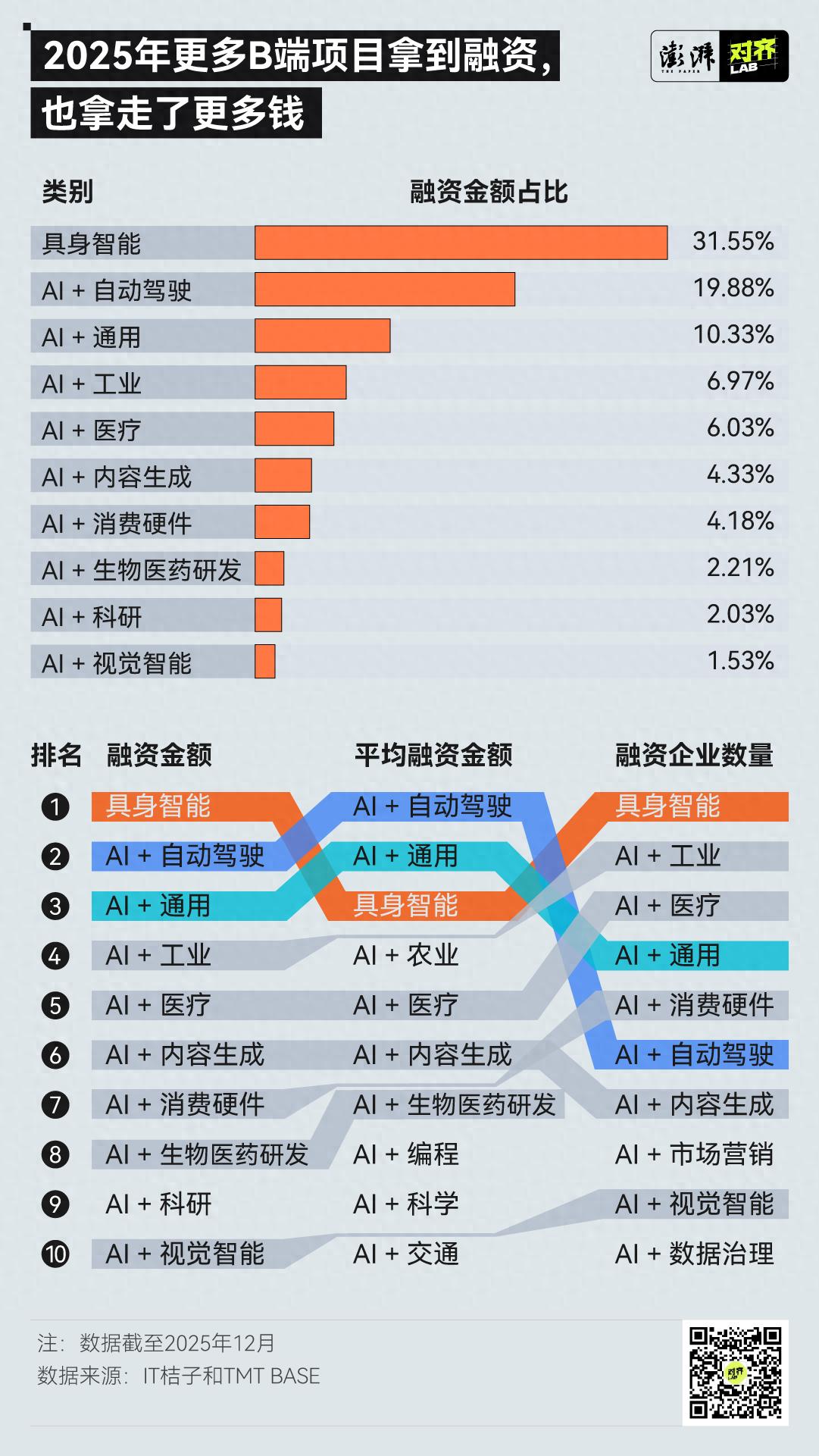 有趣的是,在互联网及大众端有着超高声量的C端AI项目,吸金能力却形成了鲜明反差。在融资企业数量、融资金额、平均融资金额等指标上,尽管十大AI应用场景略有变化,但也能发现To B项目拿走了更多的钱,比如具身智能、自动驾驶、AI通用领域。