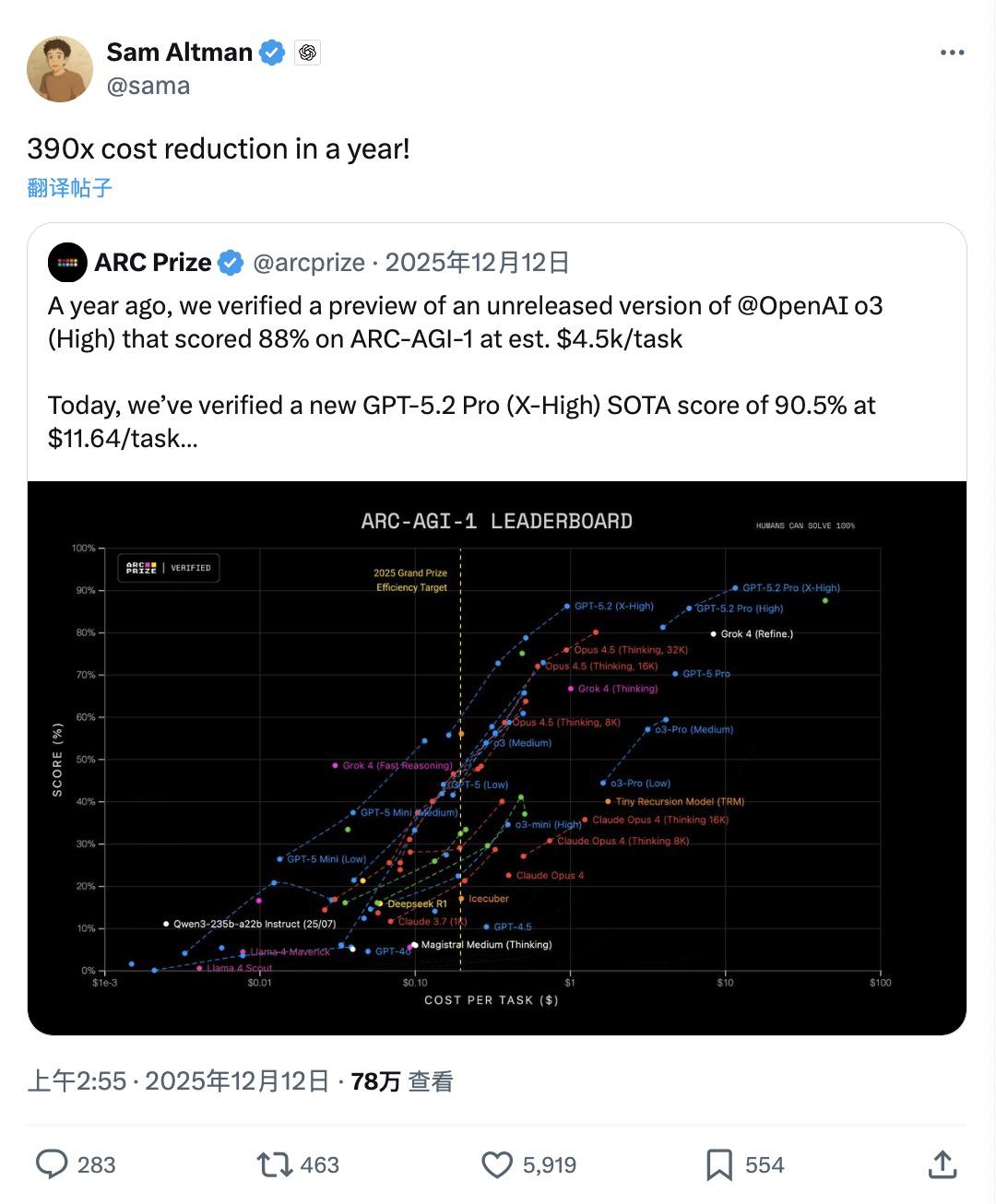 2024年,OpenAI o3模型跑一次测试要花4500美元,2025年GPT-5.2只要11.64美元,成本直接砍了390倍。而测试得分则从88%提升到90.5%。图片来源:X。