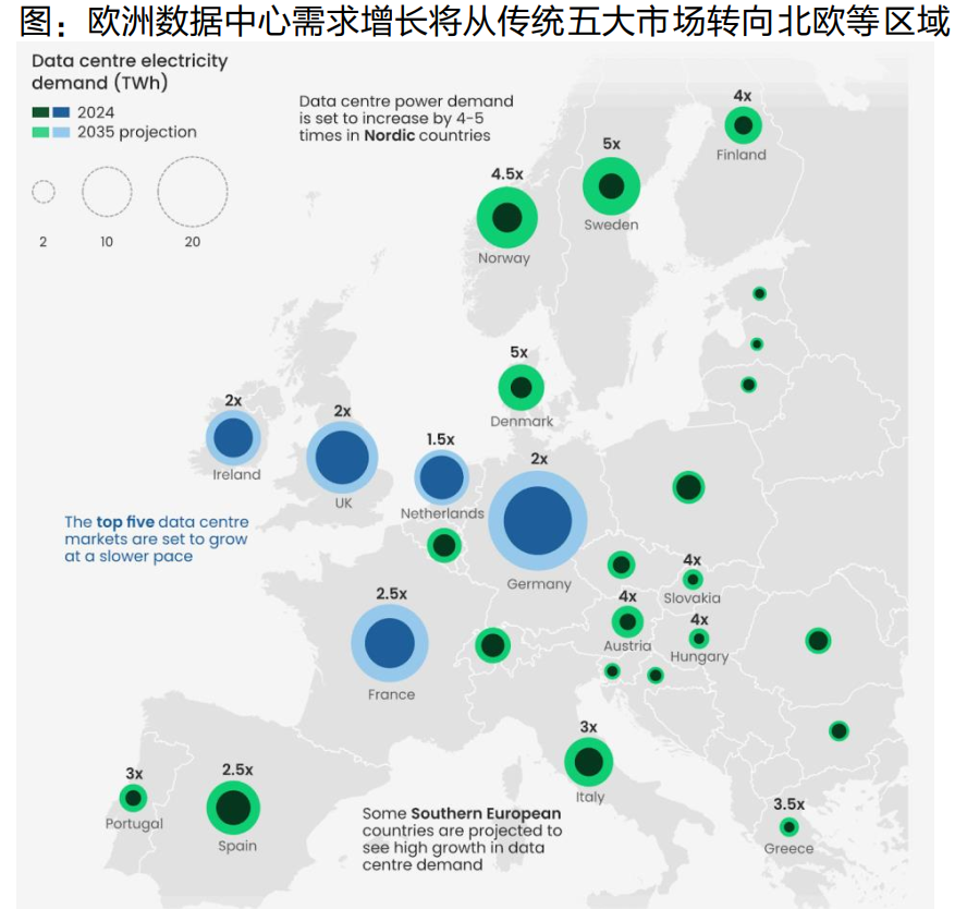 ②电力瓶颈凸显:数据中心是“电老虎”。在传统核心枢纽FLAP-D(法兰克福、伦敦、阿姆斯特丹、巴黎、都柏林),数据中心已消耗了这些城市33%-42%的电力,在都柏林甚至高达80%。ICIS估计,到2030年欧洲数据中心电力需求份额将从3%增至4.5%,其增长贡献度将超过电动汽车。现有电网,尤其是核心城市的电网,在容量和接入排队时间(长达8年以上)上已无法满足爆炸式增长的需求。