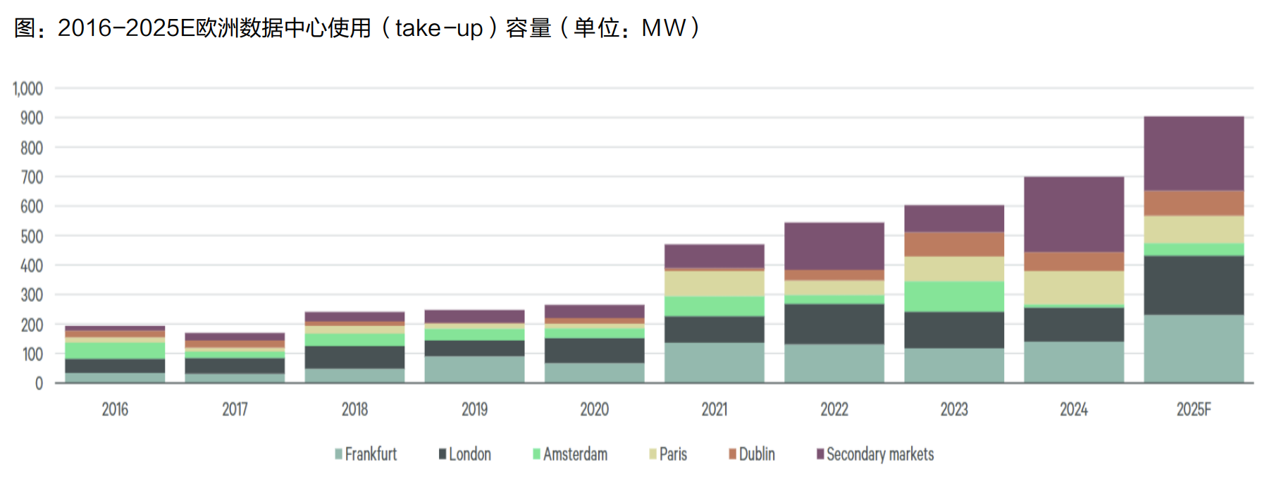 ①建设加速,需求激增:欧洲作为全球第三大数据中心市场,正奋起直追。欧盟启动“InvestAI”计划,目标将数据中心容量提升三倍。2024年,欧洲数据中心投资创下690亿美元的历史新高,北美云服务巨头(CSP)是主要推动力。CBRE预测,2025年欧洲数据中心供应量将达871MW,同比增长34%。