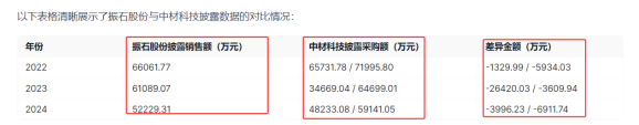更令人担忧的是,振石股份招股书与客户披露的数据出现了明显的“打架”现象。以重要客户中材科技为例,振石股份披露的销售额与中材科技年报中的采购额存在显著差异。这种不一致并非个例,而是跨越多个年度,涉及金额巨大,直接动摇了招股书的可信度。