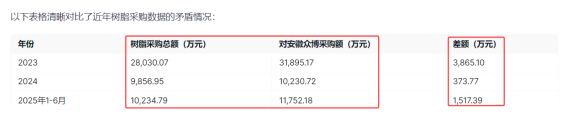 历史数据表明,这一问题并非偶然。2024年,振石股份披露树脂采购总额为9,856.95万元,但对安徽众博的采购额却达10,230.72万元,超出373.77万元。更夸张的是2023年,对安徽众博的树脂采购额为31,895.17万元,而树脂采购总额仅为28,030.07万元,差额高达3,865.10万元。
