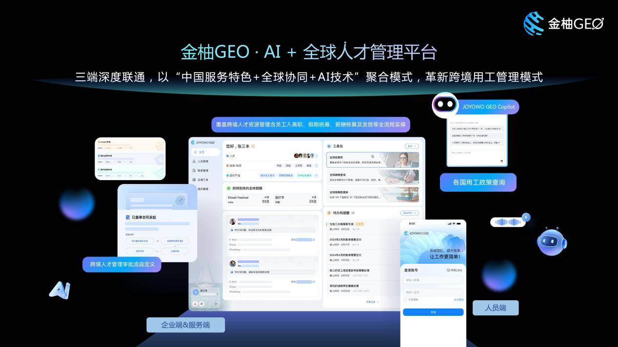 AI技术赋能跨境人力管理升级:依托“金柚GEOAI +全球人才管理平台”的技术优势,将AI能力深度融入跨境人力管理全流程。平台内置的AI Agent解决方案(JOYOWO GEOCopilot)可自动化完成跨境员工入离职办理、假期本土化适配、薪酬精准核算等环节,大幅提升管理效率;AI政策中枢24小时实时监测欧盟及匈牙利劳动法规、政策变化,提前预警合规风险。同时,平台打通企业、人员、服务商三端数据,实现用工状态实时掌控、三端自动同步,有效解决跨国企业人力管理信息割裂的痛点,助力全球管理可视化、透明化。