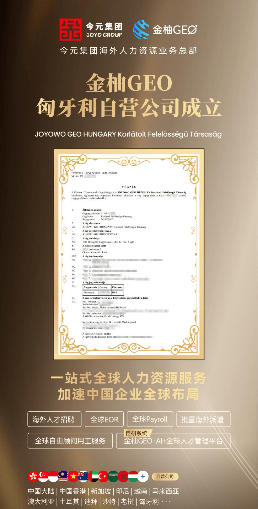 来源标题:今元集团匈牙利自营公司成立,助力出海企业稳健运营与全球化增长