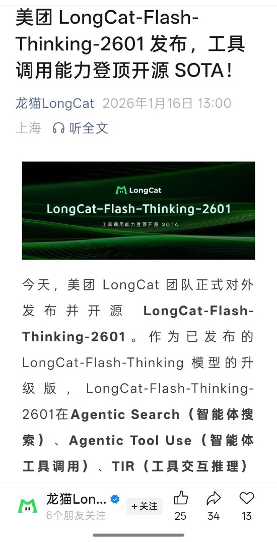 1月16日下午消息,今日,据美团LongCat官微消息,作为LongCat-Flash-Thinking模型的升级版,LongCat-Flash-Thinking-2601现已开源。