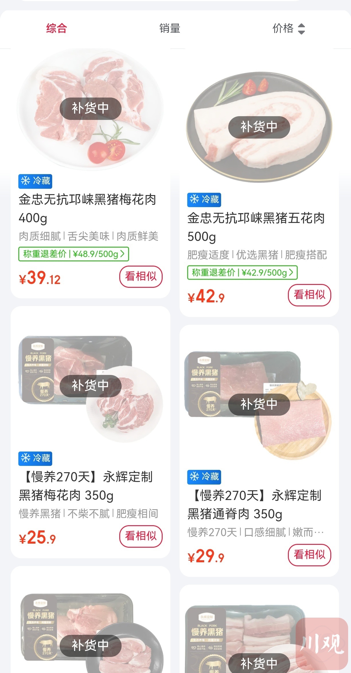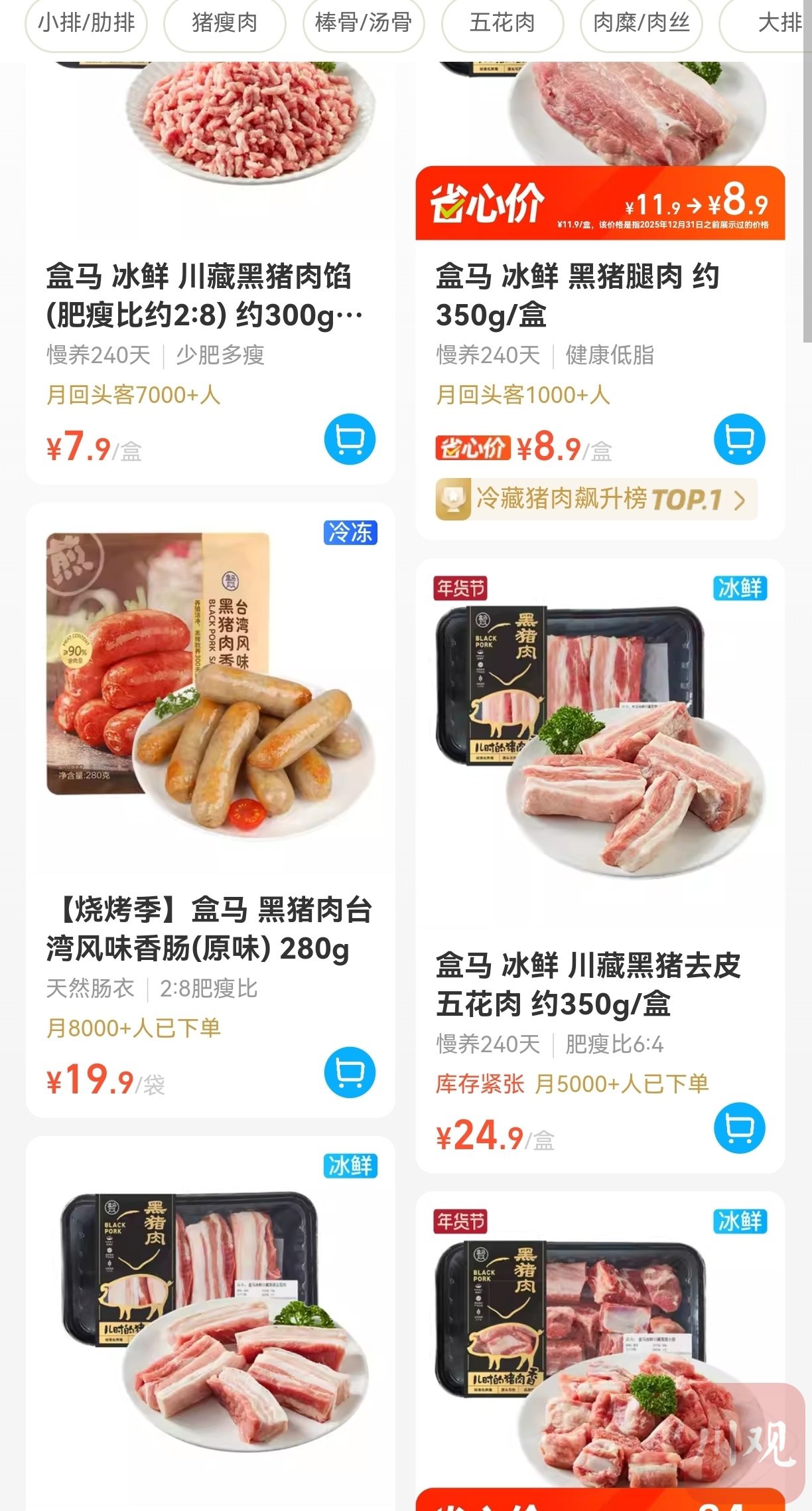 1月15日,记者在多家商超线上平台浏览发现,黑猪肉也是热销产品。盒马鲜生黑猪五花肉有超5000人下单,朴朴超市邛崃黑猪肉回购指数达93.6%,永辉超市多款黑猪肉显示“补货中”。盒马鲜生成都区域肉禽采购相关负责人向记者透露,2025年,盒马鲜生在成都区域销售的黑猪肉同比增长了近30%。