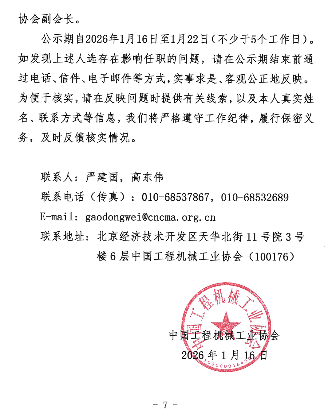 公示期自2026年1月16日至1月22日(不少于5个工作日)。如发现上述人选存在影响任职的问题,请在公示期结束前通过电话、信件、电子邮件等方式,实事求是、客观公正地反映。为便于核实,请在反映问题时提供有关线索,以及本人真实姓名、联系方式等信息,我们将严格遵守工作纪律,履行保密义务,及时反馈核实情况。