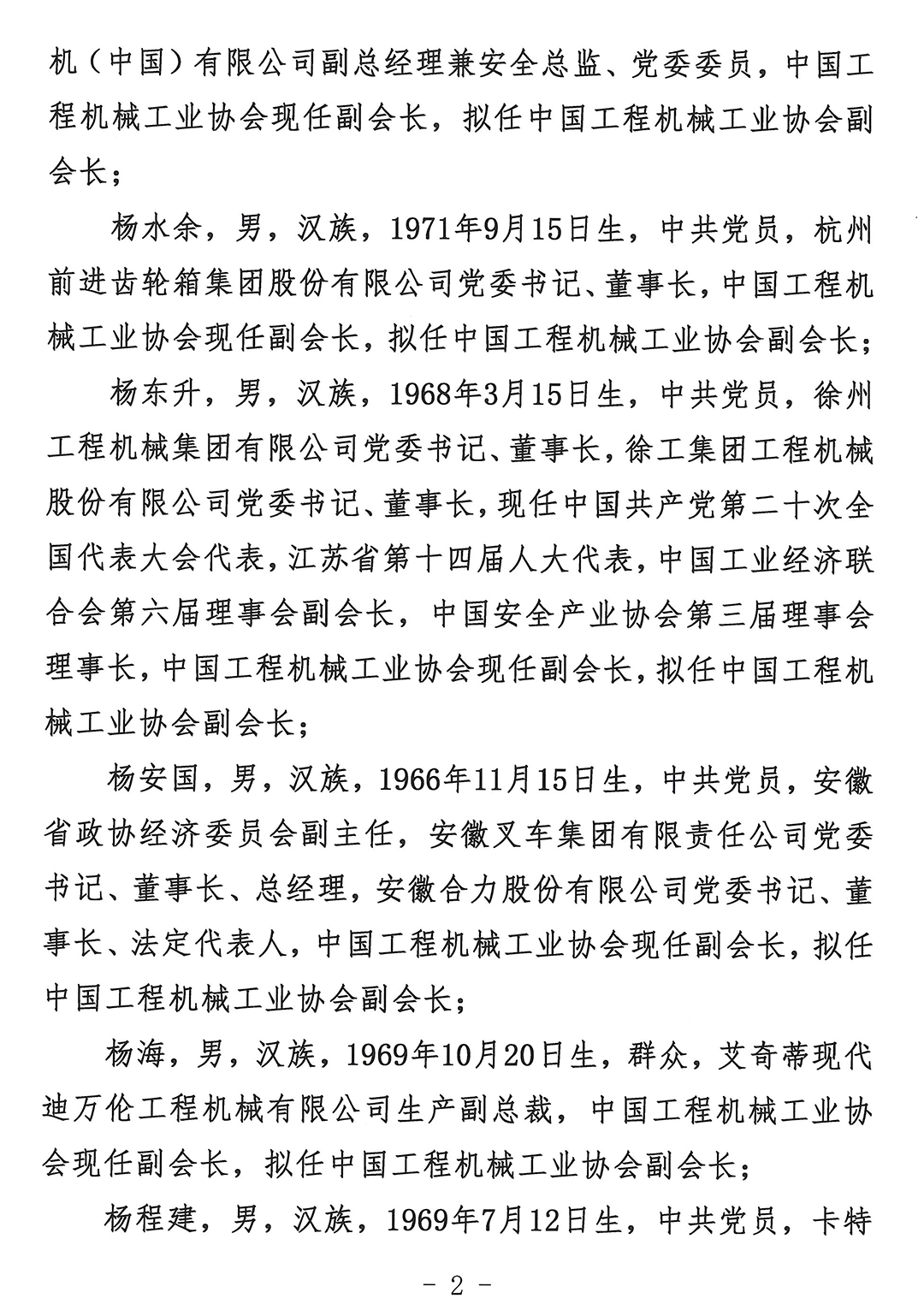 杨程建,男,汉族,1969年7月12日生,中共党员,卡特彼勒(中国)投资有限公司董事长、全球高级副总裁、法定代表人,中国工程机械工业协会现任副会长,拟任中国工程机械工业协会副会长;
