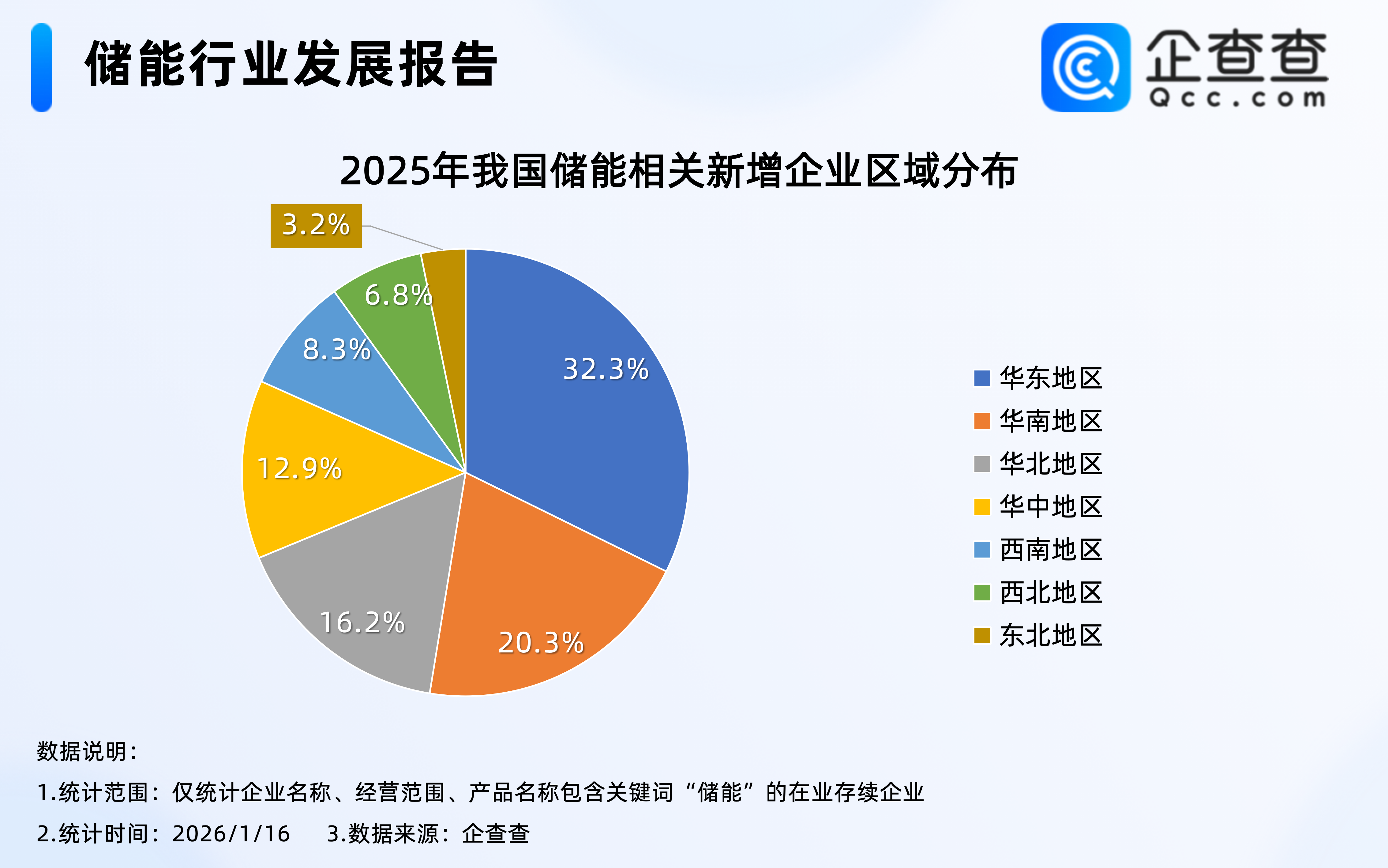 企查查数据显示,2025年注册的10.7万家储能相关企业中,超三成位于华东地区,占比32.3%,其次是华南地区,占比20.3%,东北地区相对最少,占比3.2%。