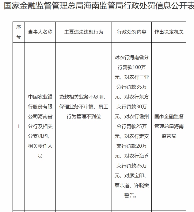 日前,农业银行海南省分行及相关分支机构被国家金融监督管理总局海南监管局罚款235万元,原因是贷款相关业务不尽职、保理业务不审慎、员工行为管理不到位。具体来看,海南省分行被罚款100万元,三亚分行被罚款35万元,海南东方支行被罚款30万元,儋州支行被罚款25万元,安定支行被罚款20万元,海秀支行被罚款25万元。